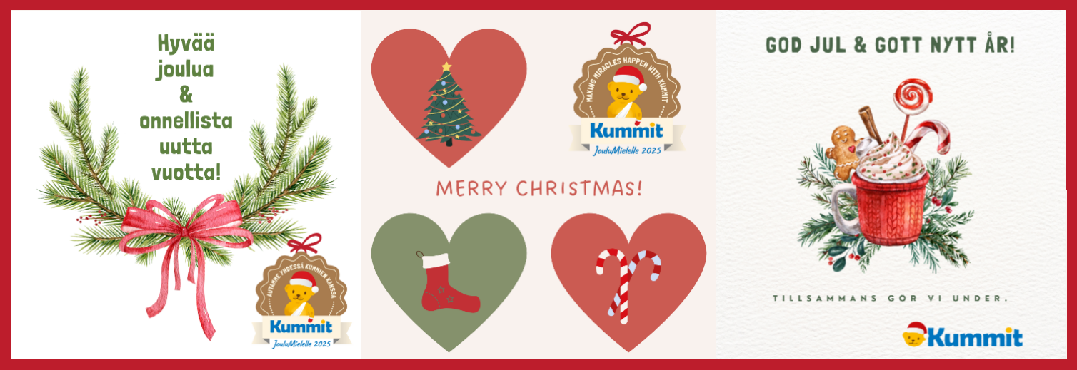 Tänä vuonna ohjasimme joulutervehdyksiin varatut rahat Lastenklinikoiden Kummit ry:n joulukeräyksen kautta pienille potilaille.