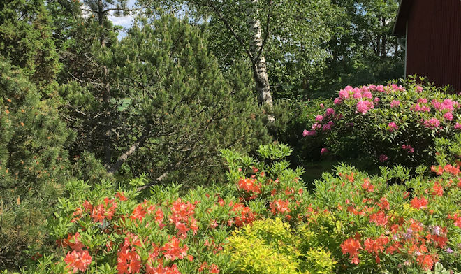 Hyviä erikoiskasveja ovat mm. punalehtiset heisiangervot. Heisiangervoja saa myös rungollisina pikkupuina. Samaa värimaailmaa, purppuranpunaista, löytyy myös ’Faassen’s Black’ hurmevaahterasta.