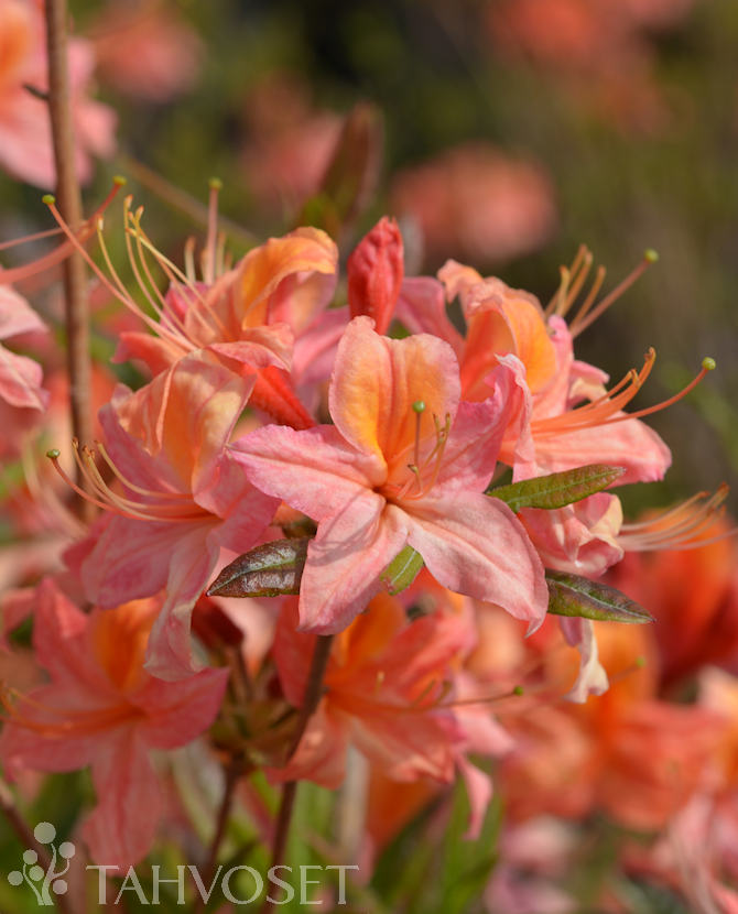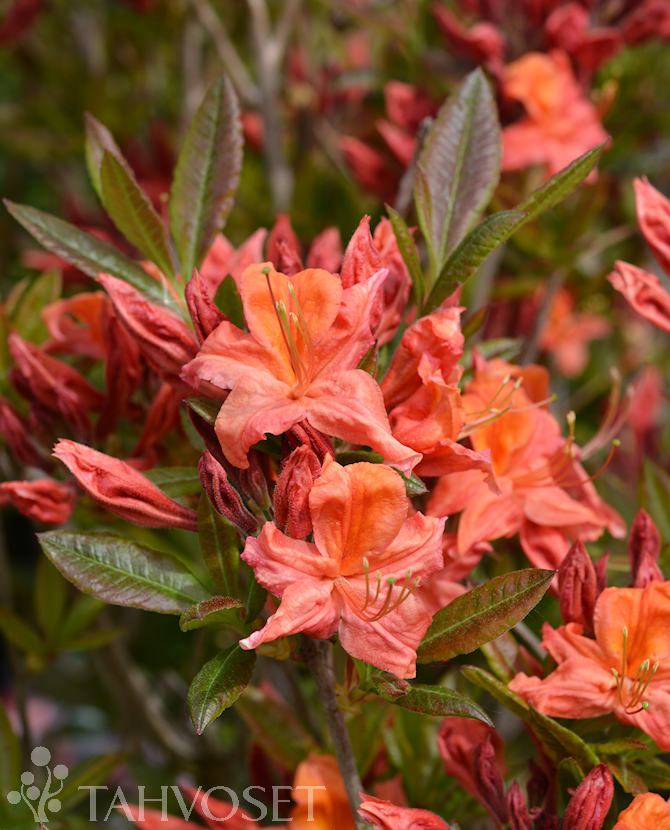 Punaoranssit, näyttävät kukat, joissa mieto tuoksu. Kukat puhkeavat kesäkuun alkupuolella. Syysväri tummanpunainen. Kasvaa 10 vuodessa reilun metrin korkuiseksi. Ghent-Ryhmä. TTA-128.