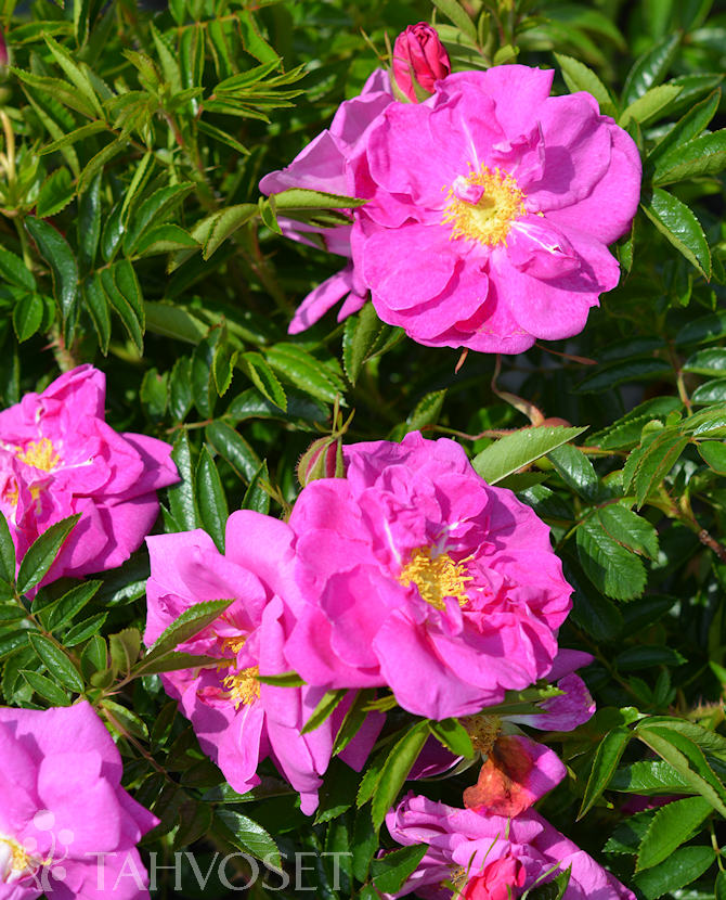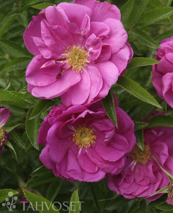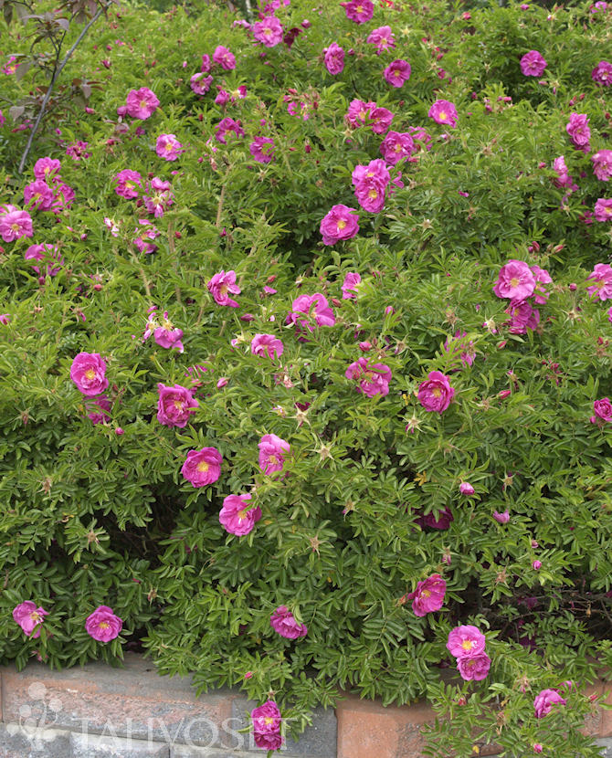 Rosa nitidan ja R. Hansan risteytys. Kasvutapa aluksi nuokkuva, mutta vanhempana pystykasvuinen. Hehkuvan vaaleanpunaiset kukinnot ovat puolikerrotut ja tuoksuvat. Kukkii saman vuoden versoilla kesäkuun lopusta heinäkuun loppuun. Syysväri kellanpunainen. Tekee runsaasti juurivesoja. Korkeus 1-1,5 m. Kestävä, helppohoitoinen. Sopii rinteisiin ja luiskiin sitomaan maata, myös ryhmiin ja aidanteiksi.