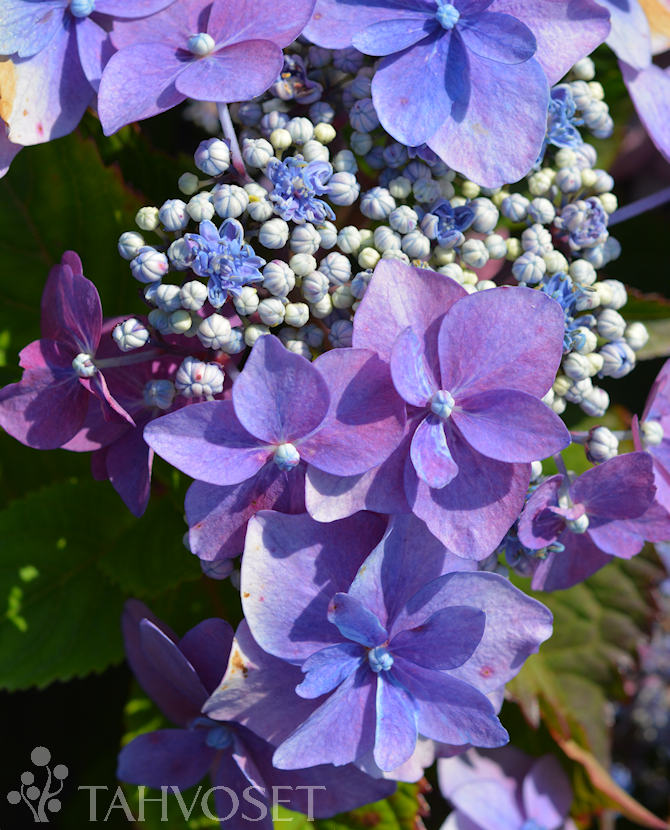Safiirihortensia. Violetinpunaiset*, keltakeskustaiset laitakukat reunustavat pitsimäistä keskustaa. Kukkii runsaasti sekä uusilla että vanhoilla versoilla. Lehdistö on tummanvihreä. *Sininen väri riippuu maan pH-tasosta, happamassa maassa sinertävät kukat. Proven Winners® kokoelma.