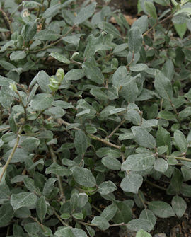 Hieman koheneva maanpeitepensas. Lehdet harmaanukkaiset, versot punertavat. Vaatimattomat, pehmeän harmaanukkaiset norkkokukinnot heti lehtien puhkeamisen jälkeen. Lyhytkestoinen ruska keltainen. Levittäytyy nopeasti. Maanpeitekasviksi rinteisiin ja liikennealueille, TTA-495. FinE®.