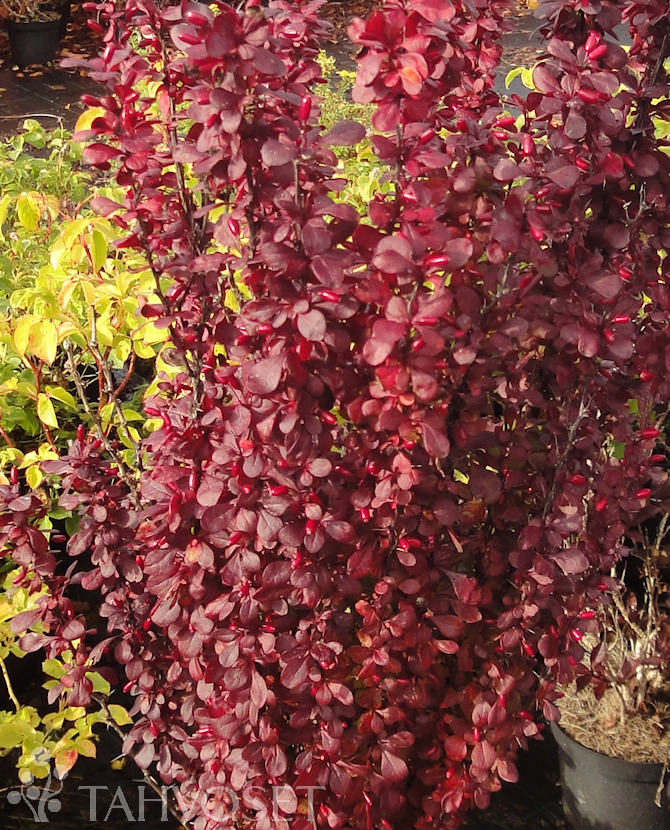 Kapea, pilarimainen kasvutapa. Lehdet syvän purppuranpunaiset, syysväri punainen. Versot piikkiset. Pienet keltaiset kukat ja syksyllä punaiset, syömäkelvottomat marjat, jotka säilyvät pensaassa pitkään. Erinomainen huomiokasvi.