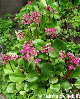 Isot, herttamaiset, talvivihannat lehdet. Sateenvarjomainen rosa kukinto kukkavanojen latvassa. Helppohoitoinen.