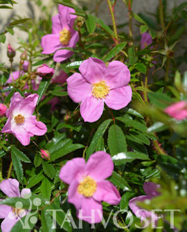Matala- ja tiheäkasvuinen. Lehdet kiiltävät, sirot, syksyllä tummanpunaiset. Ruusunpunaiset, yksinkertaiset kukat kesäkuusta elokuulle. Tuoksu mieto, miellyttävä. Kirkkaanpunaiset, pienet, pallomaiset kiulukat säilyvät talven yli. Juurivesoja muodostoo melko runsaasti. Kestävä ruusu myös kuivempiin kohteisiin. Rinteisiin ja luiskiin, mukaan ryhmiin.