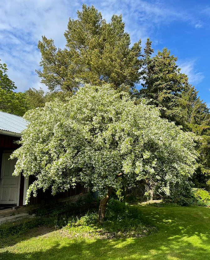 Leveälatvuksinen pikkupuu. Lehdistö vaaleanvihreä. Nuput vaaleanpunaiset, valkoiset tai punertavat. Kukkien halkaisija n. 5 cm. Puu peittyy upeasti valkoiseen kukintaan touko-kesäkuun vaihteessa. Hedelmät punaiset ja marjamaiset n. 1 cm läpimitaltaan. Hyvä talvenkestävyys.