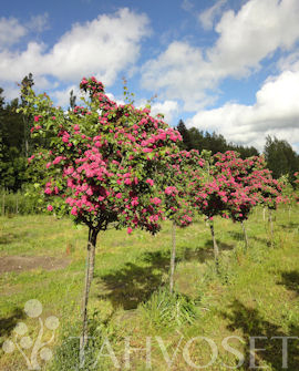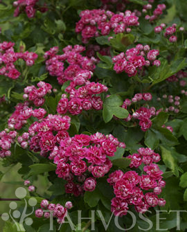 Vartettu orapihlajaan. Ruusunpunaiset, voimakkaasti kerrotut kukat terttuina. Erittäin runsas kukinta kesäkuussa. Ruskeanpunaiset marjat elokuussa. Lehdet pienet ja tylppäliuskaiset. Syysväri kellanpunainen. Pidä latvus elinvoimaisena poistamalla säännöllisesti huonosti kukkivia versoja. Puumainen pensas tai pikkupuu yksittäin, ryhmiin.
