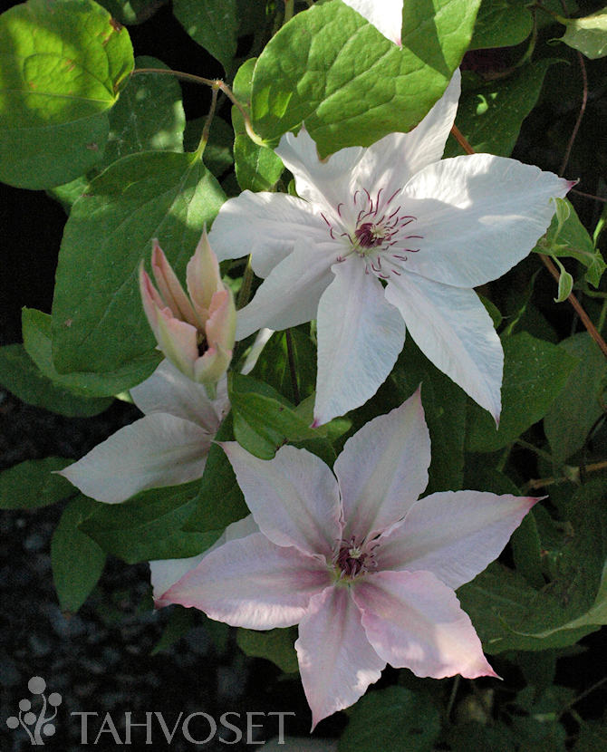 Pinkit (Ø 12 cm) kukat, joiden terälehtien keskellä tummempi raita. Runsaasti kukkiva, sirokasvuinen köynnös seinustalle, pergolaan, säleikköön. Myös ruukkuistutuksiin. Vaatii tuen. Korkeus 2-2,5m.