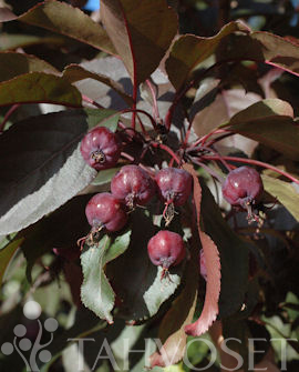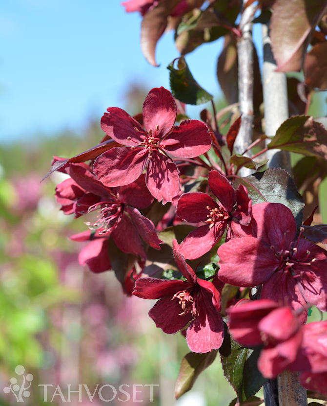 Lehdet koristeelliset ja tumman ruskeanpunaiset. Kukat karmiininpunaiset. Hedelmä pyöreä, pitkäkantainen ja tummanpunainen. Vartettu, perusrunko M. 'Bittenfelder'