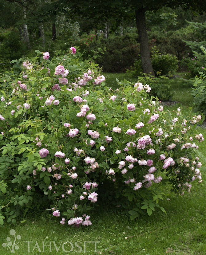 Löytöruusu, ilmeisesti 'Blush Damask'. Kuppimaiset, kerrannaiset ja voimakkaasti tuoksuvat vaaleanpunaiset kukat. Kukkii heinäkuussa runsaasti edellisvuoden versoilla. Rentoversoinen, tiheäpiikkinen, tekee runsaasti juurivesoja. Korkeus 1-1,5 m.