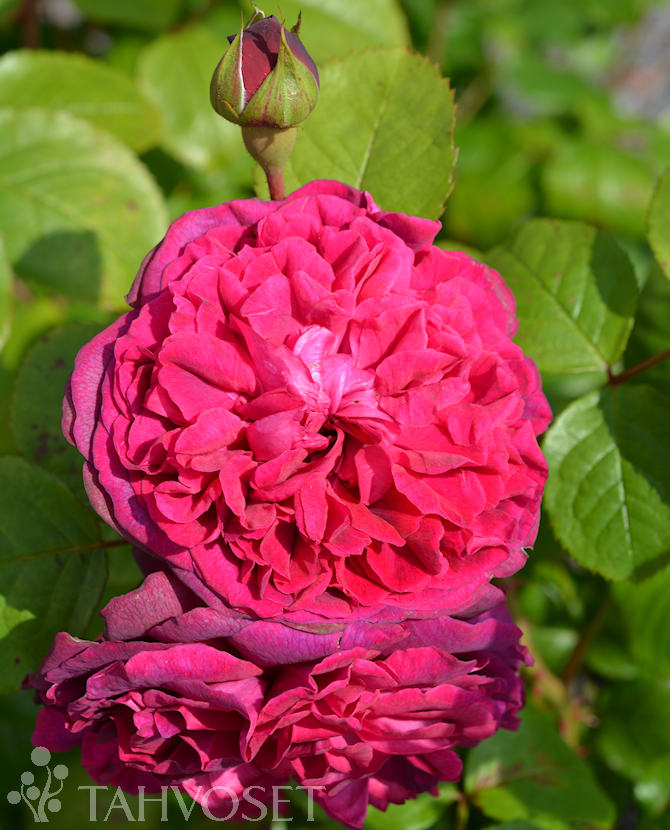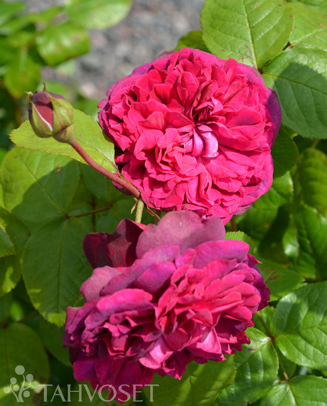 Purppuranpunaiset, kerrotut ja voimakkaasti tuoksuvat kukat. Kukinta jatkuu syksyyn saakka. Hyvä leikkokukka. Kasvutapa pysty ja pensasmainen. Versot piikkiset. Korkeus 1-1,5 m. Aurinkoinen kasvupaikka. Talvisuojaus. Lajike tunnetaan myös nimellä 'William Shakespeare'.